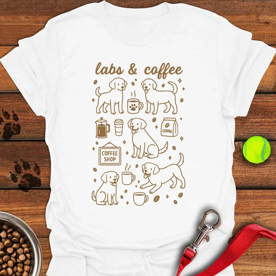 Labs & Coffee Doodle T-Shirt Stylish Dog Clothes Special Mothers Day Presents. T-Shirt printed in the USA Exclusive products made by: Petshi. Material: 5.3-ounce, 100% cotton. Seamless double-needle 7/8. Taped neck and shoulders; Tearaway label. Decoration type: Digital Print. All products are made to order and proudly printed to the best standards available. They do…