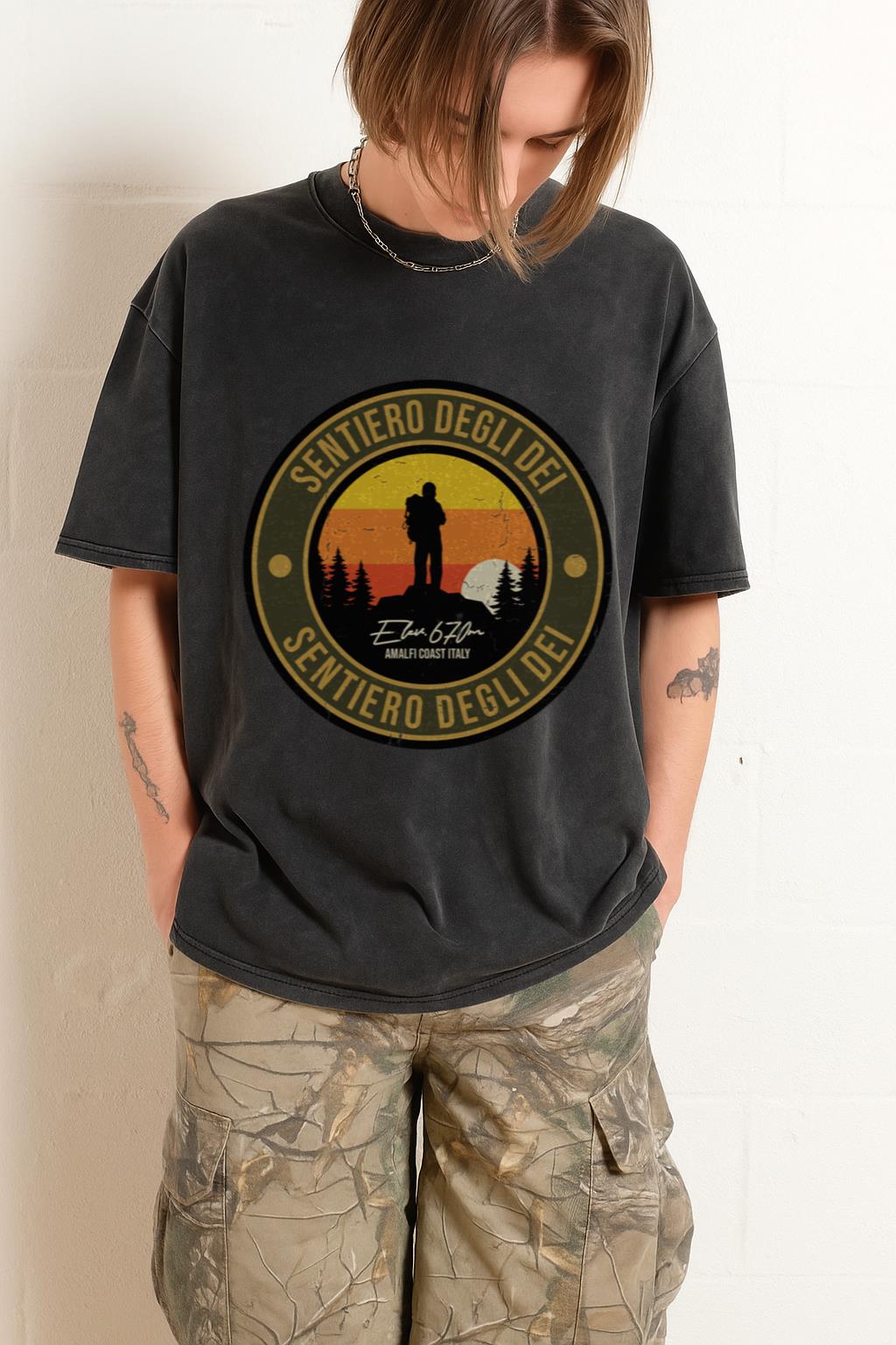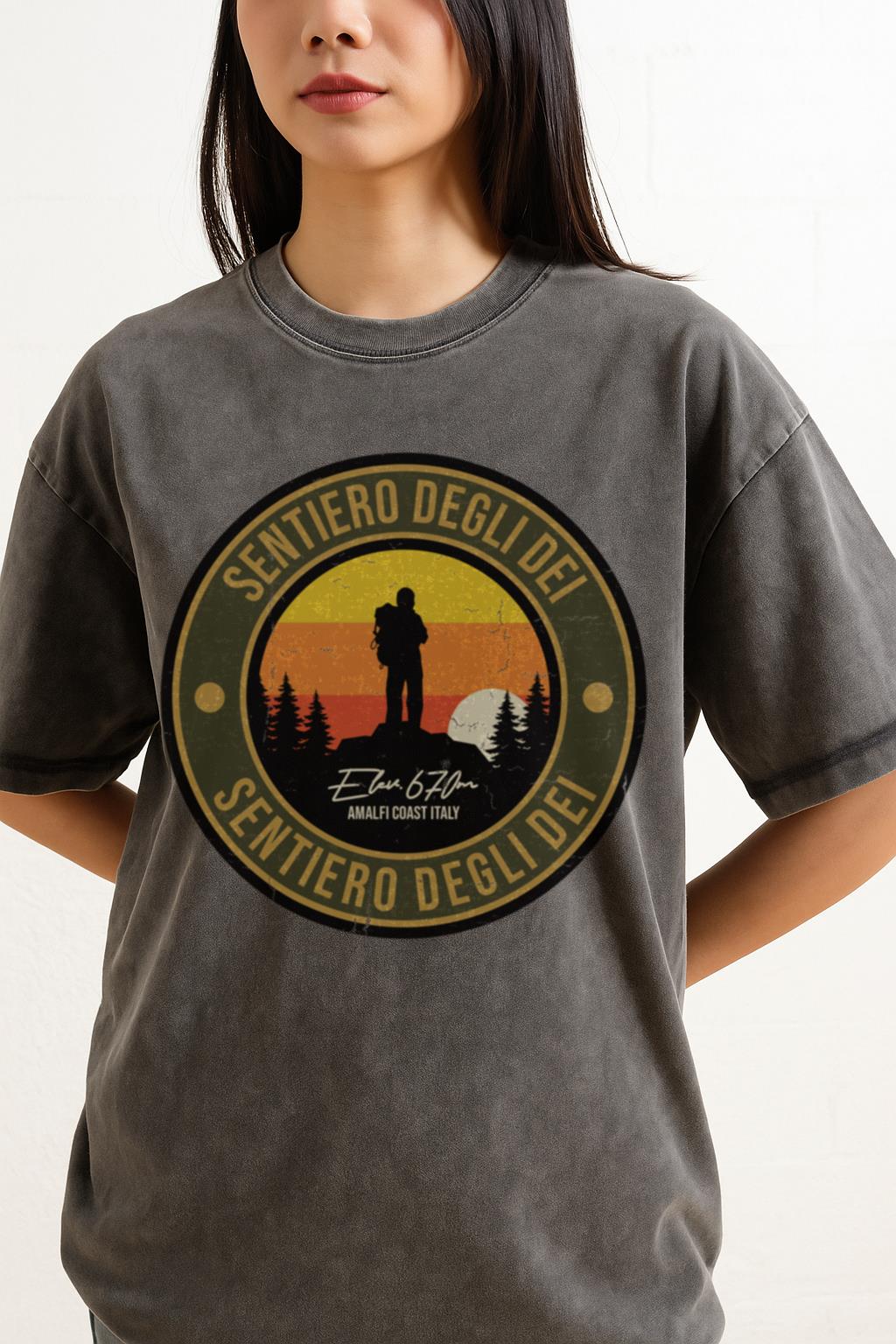 Embark on a journey to the iconic Sentiero degli Dei (Path of the Gods) with this unique Italy Mountain Hiking Trail T-shirt. Perfect for trekkers, climbers, and anyone who has experienced the breathtaking beauty of Italy’s Amalfi Coast. Made from 100% soft cotton with a distinctive black acidwash finish, this graphic tee is a comfortable and stylish way to commemorate your adventures.